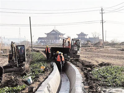 连日来,冬日的晴好天气持续在线,高标准农田项目建设的步伐也明显加快。在丹徒区辛丰镇东街村,多条农田水泥渠道同步开工,现场,机器轰鸣,压塑一体机在铲车的帮助下,自西向东移动,车后留下的水泥渠道内,三名工人相互配合,一人压底、一人抹平墙体,一人侧面加固,分工明确。工作人员介绍,由于渠道建设须根据农田走势,所以曲线渠道的日均推进速度为150米左右,如果是笔直的渠道,最快可实现日均300米。