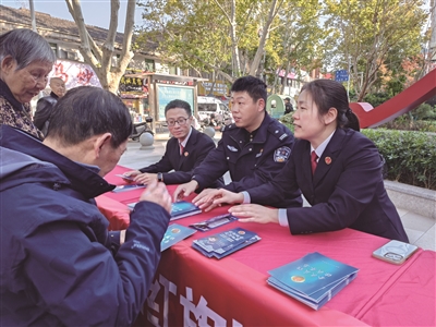 为了提升群众法治意识,解答群众法律困惑,近日,句容市检察院在该市1912文化休闲商业街区开展法治宣传活动。图为检察干警向群众宣传检察职能。游丽 张驰川 摄影报道