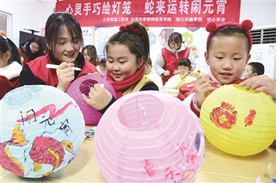 2月10日,润州区和平路街道三茅宫第二社区开展“心灵手巧绘灯笼 ‘蛇’来运转闹元宵”活动,志愿者指导小朋友在五彩灯笼上描绘元宵节主题画,感受传统民俗文化,喜迎元宵佳节的到来。