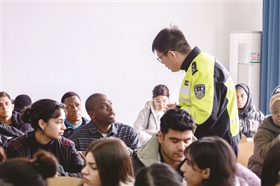 近日,在江苏大学春季开学之际,镇江市公安局交警支队京口大队的青年民警周帅,来到江苏大学外国留学生学院,为来自36个国家的100多名外国留学生新生,开展了交通法规和交通安全“开学第一课”宣教活动。马镇丹 谈德捷 张旭晨 摄影报道