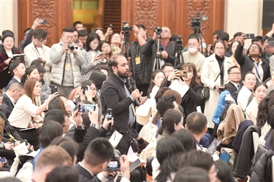 3月3日,全国政协十四届三次会议新闻发布会在北京人民大会堂举行。这是巴西劳动者电视台记者在发布会上提问。新华社发