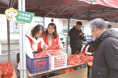 其中,“浓农帮帮团”的“浓农集市”摊位格外引人注目,摊位上摆放的草莓、土鸡蛋等农产品吸引了不少居民前来选购(见图 蒋丽 摄)。这个由街道志愿者组成的团队,一直致力于帮助本地农户解决农产品销售难题,他们利用线上平台,宣传推广本地新鲜农产品,在社区内设置固定销售点。如今,居民们足不出社区,就能购买到物美价廉的农产品,农户们也不再为销售发愁。这一常态化的助农举措,实现了居民与农户的双赢。“今天现场准备了60份草莓,近200斤,都已经卖出去了,现场没买到的居民都能线上下单购买。”利源家庭农场的负责人顾从介绍。