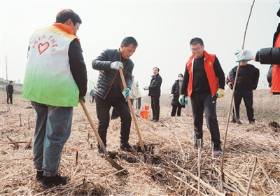 3月11日,丹徒区江心园区以“党建红”引领“生态绿”植树节活动举行。党员志愿者挥锹培土、扶苗浇水,为长江生态廊道再添生机。同时,普法志愿者结合生态保护典型案例现场普法,推动绿色发展理念深入人心。王清逸 摄影报道