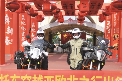 3月11日,两摩友骑行穿越亚欧非之行出征仪式在丹徒区世业镇开心休博园举行,这两名摩友为我市开心休博园员工杨帆(左)及其朋友毛烨超,预计用3个多月时间,骑行4万多公里,穿越太平洋、北冰洋、大西洋、印度洋等地区的40多个国家,最终到达非洲的南非开普敦,挑战运动极限,了解不同文化,展示中国形象。