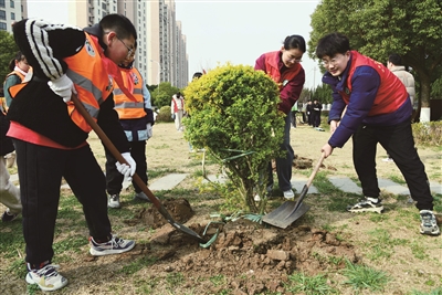 日前,和平路街道新金江社区联合江苏大学、镇江海事局等多家党建联盟单位开展“春到三月 植树护绿”活动,志愿者来到新金江渔文化主题公园植树,共同呵护绿色家园。石玉成 摄影报道