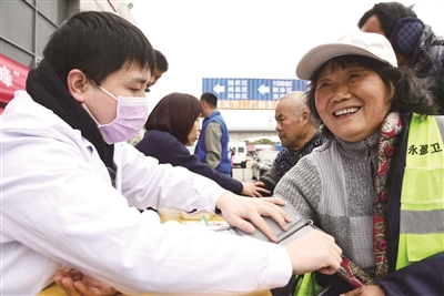 日前,官塘桥街道秀山村开展“志愿服务进市场”活动,组织志愿者来到辖区的市农副产品批发市场,为经营户、货运司机、保洁员等提供健康义诊、义务理发等惠民服务。石玉成 摄影报道