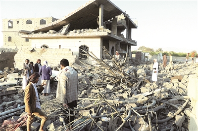 3月16日,在也门首都萨那,人们站在被美国空袭后的房屋废墟中。