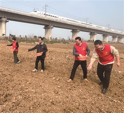 在留村河北侧农田里,志愿者向党员们介绍了紫云英作为绿肥作物的重要作用,它不仅能改善土壤结构、增加土壤肥力,还能保护生态环境。同时,志愿者还分享了播撒紫云英种子的技巧。党员们认真聆听,挥着手一遍遍练习。大家分工协作,一同将希望的种子播撒在土地里(见上图 王青 摄)。