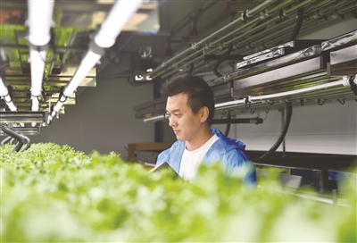 4月9日,位于丹徒经开区的镇江昂科丰光电科技有限公司,研究人员在新型光伏“集装箱式植物工厂”里查看蔬菜生长情况。该公司主要进行新型光电农业复合应用技术的研发和推广,“集装箱式植物工厂”广受野外作业单位欢迎。