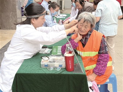 当天上午9时许,活动现场宛如一个热闹的小市集,各个服务区域划分清晰,居民们穿梭其中,享受着家门口的便捷服务。在爱心义诊区,量血压、测血糖、听心率、查视力……医护人员们动作娴熟、认真细致,检查的同时还耐心地询问居民的生活习惯和饮食情况,并给予专业健康建议(见图 丁宇 摄)。