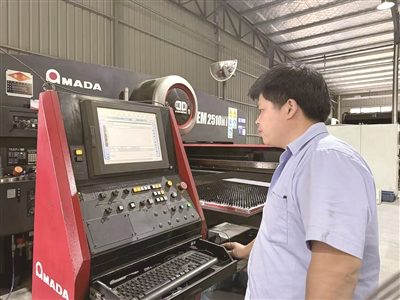 在银佳集团车间,只见技术人员正在数控冲床前对钣金冲切进行参数设置(见图),随着机器的高速运转,金属薄板在高精度的激光切割下,形成一排排精密整齐的孔洞,这样如火如荼的生产场景,不仅是企业实力的生动写照,更见证着一季度销售额突破1.5亿元的亮眼成绩。“面临市场的挑战,银佳作为一家深耕行业30余年的企业,也在持续挖掘自身潜力,追求焕新破圈。”银佳集团副总经理王勇说,在三茅街道的牵线搭桥下,企业正在与国际知名企业洽谈合作,有望迎来新的市场机遇。