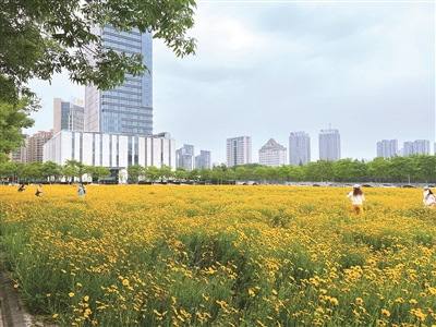 城市街角花园里金鸡菊盛开,市民打卡拍照。单杉 摄影报道