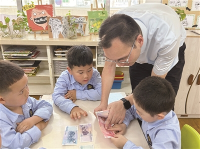 近日,镇江市中山路中心幼儿园(仁章园)开展“小钱币 大奥秘”实践活动。活动邀请家长志愿者化身“金融导师”,以故事形式讲解钱币的起源演变,带领孩子们认识不同面值的人民币。孩子们化身“小小收银员”,学习点钞技巧,通过模拟银行存取款、超市购物等场景,将数学知识融入日常生活,提高了社会实践能力。