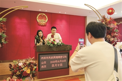 5月20日,众多年轻人在丹阳市民政局婚姻登记处领证并拍照留念。备受年轻人青睐的“5·20”“5·21”两个登记日,该婚姻登记处预约登记名额已爆满,将至少有200对新人在这两天喜结连理。