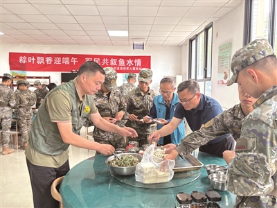 5月28日,扬中市退役军人事务局、三茅街道退役军人服务站、长江拥军服务社携手广宁社区、三桥村拥军志愿者,带着食材走进武警扬中中队,开展“粽叶飘香迎端午 军民共叙鱼水情”活动,让官兵在传统节日里感受到浓浓军民鱼水情。