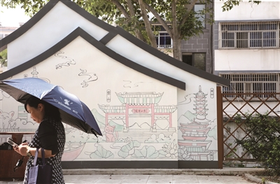 连日来,润州区和平路街道一泉社区对位于长江路301号附近的口袋公园进行美化升级。墙体上绘制了镇江代表性旅游景点——金山、焦山及西津渡,公园的座椅旁设立了“泉心小憩”标语并设置石凳,给居民和游客带来更好的体验。图为市民从文化墙前走过。文雯 邹泉 摄影报道