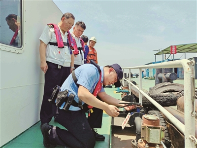 6月4日,长航公安镇江分局镇江派出所与镇江海事局大港海事处组成联合执法编队,在长江镇江段水域开展“世界环境日”和“安全生产月”双主题联合巡查。执法人员重点排查船舶非法排污、污染防治设施运行等情况,向船民讲解水环境保护知识。图为执法人员检查污染防治设施。