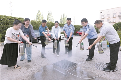 在应急处置演练中,大家认真观看消防员的讲解示范,亲手体验灭火器的使用,通过实践操作熟悉常见火灾的应急处置程序(见图 润萱 张驰川 摄)。