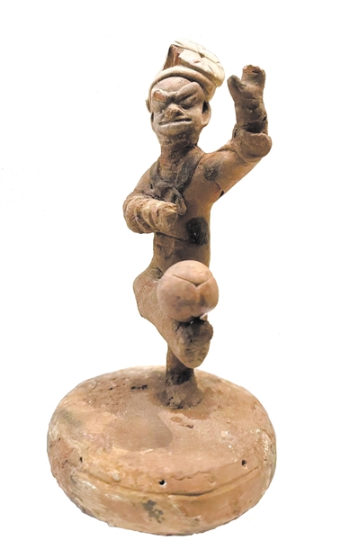宋代红陶胡人踏鼓蹴鞠像