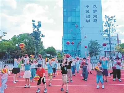 日前,扬中市西来桥镇团委联合西来桥学校开设爱心暑托班。图为孩子们在老师指导下练习运球、投篮。李亚男 摄影报道