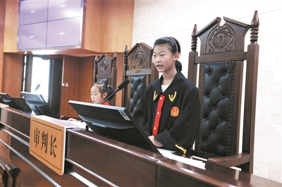 “现在开庭!”随着审判长法槌落下,一场别开生面的模拟庭审也拉开了序幕。小朋友们分别扮演审判长、书记员、法警等角色,对审理过程、法庭辩论等情景逐一进行了模拟展示,生动还原了案件审理全貌(见图 吴菲菲 摄)。