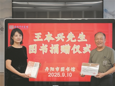 9月10日,当代文化艺术学者王本兴将其潜心创作的30册著作赠予丹阳市图书馆。王本兴,1948年出生于无锡,幼年时父亲早逝,他与弟弟便随母亲长居丹阳导墅镇大华村大麦桥自然村的外婆家。在丹阳导墅的岁月是其童年记忆里最鲜活的篇章。吴春燕 摄影报道