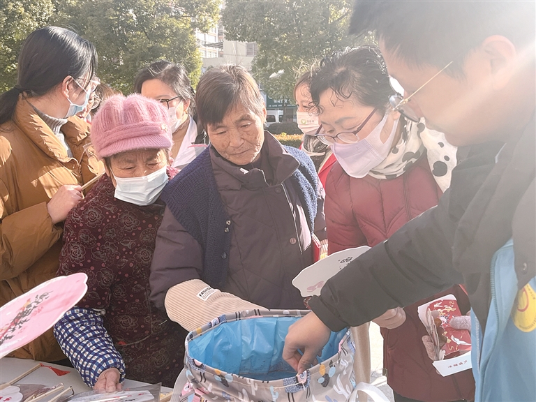 活动现场共分为服务区和游戏区。服务区的义诊、爱心义卖、反诈宣传等摊位前,相关工作人员正在给居民提供血压血糖测量、健康咨询、政策解读等服务。在另一边的游戏区,投壶、绘漆扇、拓印等也在同步进行。