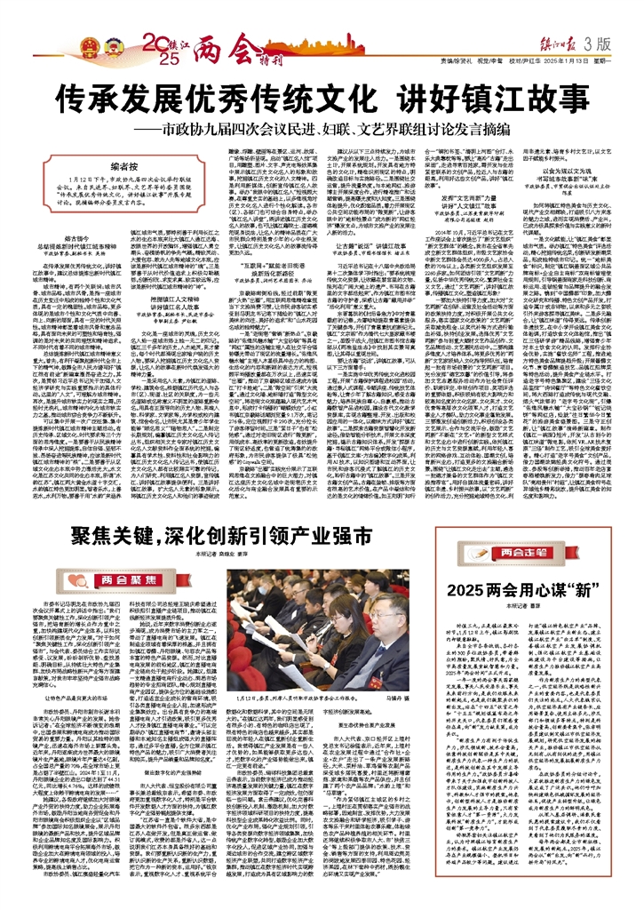 - 传承发展优秀传统文化 讲好镇江故事 编者按 1月12日下午,市政协九届四次会议举行联组会议。来自民进界、妇联界、文艺界等的委员围绕“传承发展优秀传统文化, 讲好镇江故事”开展专题讨论。现摘编部分委员发言内容。