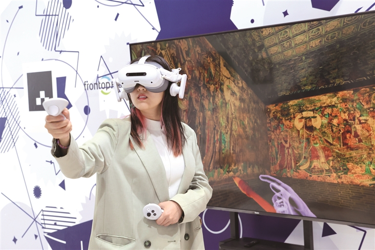 5月23日,观众在文博会现场体验VR修复永乐宫壁画。第二十一届中国(深圳)国际文化产业博览交易会5月22日在深圳开幕。本届文博会突出“文化+科技”深度融合,首次设立人工智能展区,众多文化“顶流”和科技“新势力”齐聚现场,为观众带来新鲜有趣的参观体验。 新华社发