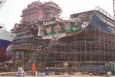 5月27日,工作人员在山东省荣成市黄海造船有限公司厂区建造船舶。