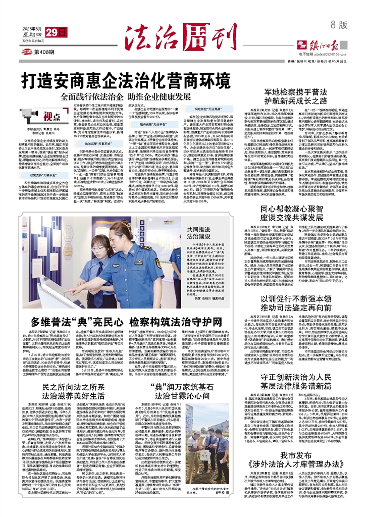 - 多维普法“典”亮民心 检察构筑法治守护网 本报讯(张晋毓 记者 张驰川)日前,扬中市检察院以“民法典宣传月”为契机,针对不同群体精准定制“法治套餐”,以群众喜闻乐见的形式让法典精神浸润民心,构筑起全维度法治守护网。 5月20日,