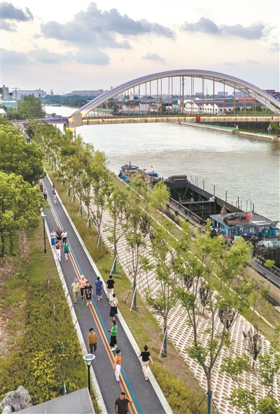 日前,丹徒区辛丰镇运河旁的彩虹步道成为附近居民傍晚休闲的好去处,大家一边欣赏运河风光,一边和邻里亲朋聊天散步。这里已然是当地热门打卡点。谢道韫 摄影报道