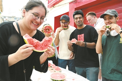 立秋将至,8月5日,来自俄罗斯、巴基斯坦、摩洛哥、尼日利亚等国的江苏大学留学生来到金山街道杨家门社区,与居民一起吃西瓜“啃秋”,表达“啃下酷夏迎接秋爽”的愿望,体验我国传统民俗。任梦雨 石玉成 摄影报道