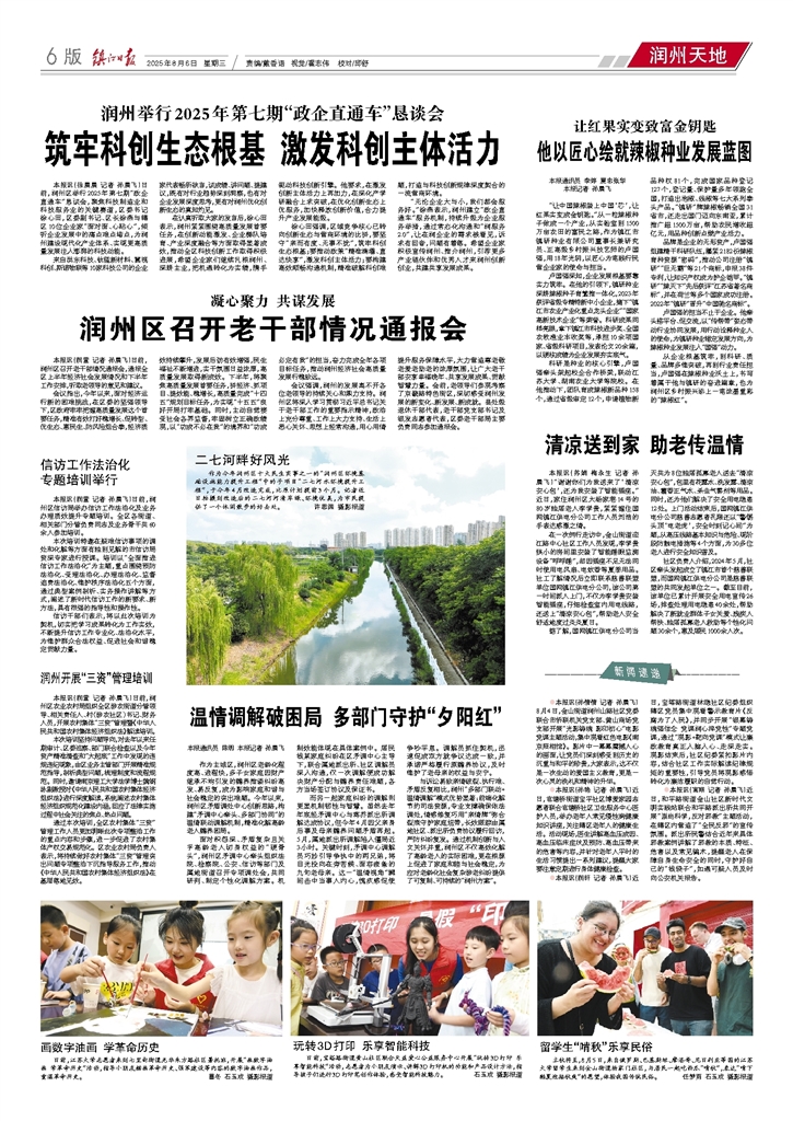 - 筑牢科创生态根基 激发科创主体活力 本报讯(徐晨晨 记者 孙晨飞)日前,润州区举行2025年第七期“政企直通车”恳谈会,聚焦科技制造业和科技服务业的关键赛道,区委书记徐心田,区委副书记、区长徐燕与辖区10位企