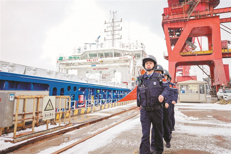 1月20日,冰雪席卷镇江,然而镇江口岸新造船舶出口业务热度不减。镇江边检站民警冒着风雪,为新造船舶“菲利西亚”轮实施出境边防检查,全力保障该轮高效通关、顺利启航。秦箫 陈超 黄帅 摄影报道