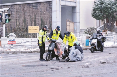 1月20日,京口交警辅警在冰雪一线快速处置轻微交通事故,为过往群众提供帮助。