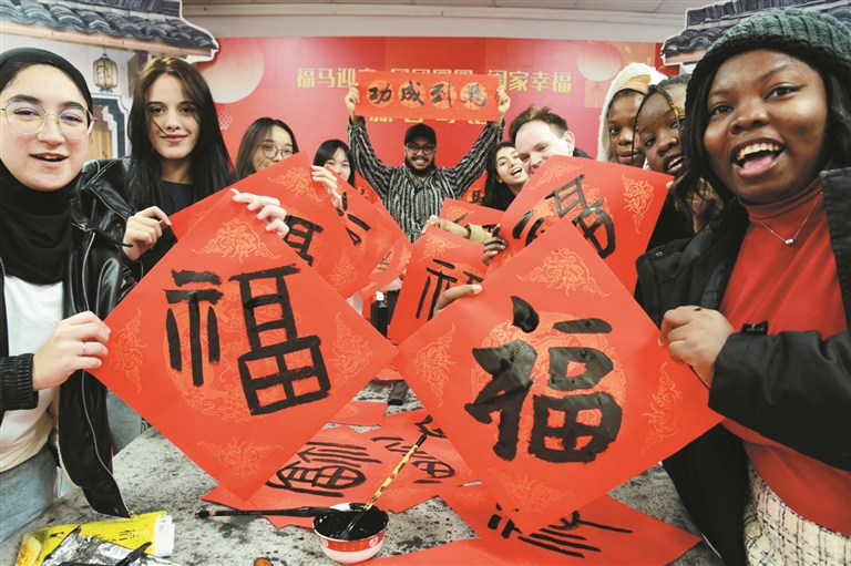 日前,来自俄罗斯、摩洛哥、尼日利亚、加纳等国的江苏大学留学生来到润州区金山街道红光太古山社区,开展“写‘福’字迎新春”活动,外国留学生在书法家指导下体验写“福”字和春联,感受中国传统文化。