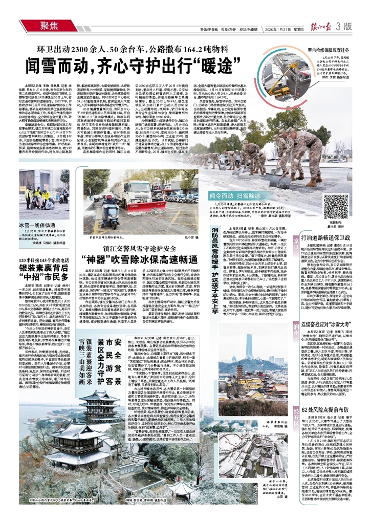- 经开区:62处风险点提前布防 本报讯(冯亦 张小波 记者 潘宇琴)1月20日,大寒节气遇上了大雪纷飞的天气。为保障城市交通运行通畅,镇江经开区迅速响应、科学调度,统筹各相关单位有序开展除雪保畅工作,全力