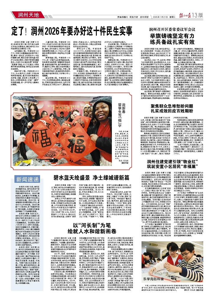 - 定了!润州2026年要办好这十件民生实事 本报讯(润萱 记者 孙晨飞)日前,经润州区第十届人民代表大会第五次会议投票表决,确定润州区2026年政府民生实事项目10项: 全民健康工程。年度投资3125万元,实施卫生健康基础设
