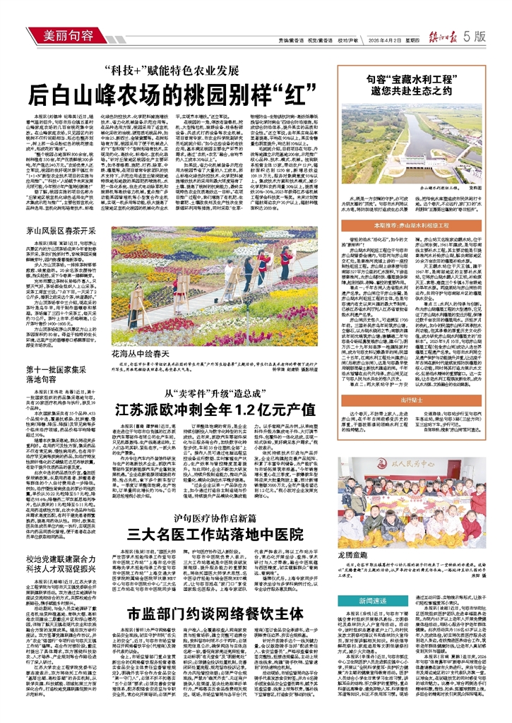 “整个桃园占地面积800余亩,桃树种植有550亩,年产优质鲜桃300多吨,年产值达240万元。”农场负责人还立军说,桃园的良好现状源于镇江市“1+1+N”新型农业技术项目的实施与应用推广。“‘科技+’入场赋予未来发展无限可能,今年预计年产值将创新高!”