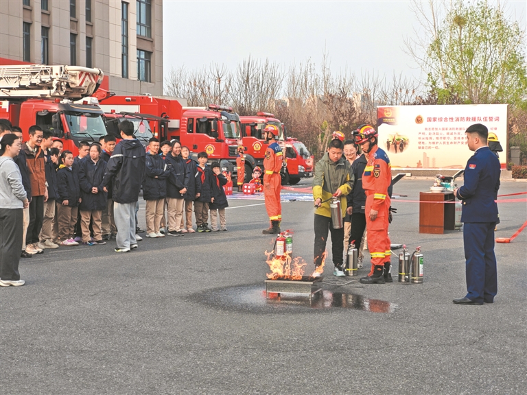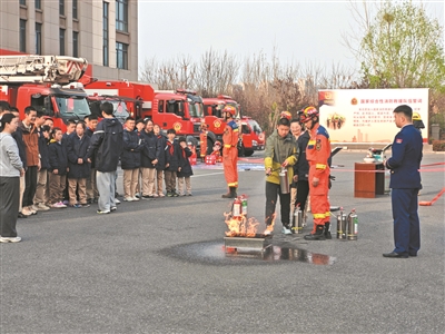 为了让安全知识入脑入心,活动设置了多个实操体验环节。学生们依次参与油锅灭火、灭火器实操(见图 韦奕 摄)、浓烟逃生帐篷、VR消防模拟等体验,消防员手把手指导孩子们掌握“弯腰、捂鼻、贴墙走”的逃生口诀,以及灭火器“提、拔、握、压”的正确使用方法。同时,消防员通过高层烟气、粉尘及可燃气体爆炸模拟实验,直观形象地讲解了各类火灾的应对技巧和预防要点。此外,消防飞行棋、云梯车乘坐等趣味互动环节,让孩子们在轻松欢乐的氛围中巩固所学安全知识,进一步加深了对消防安全的理解。