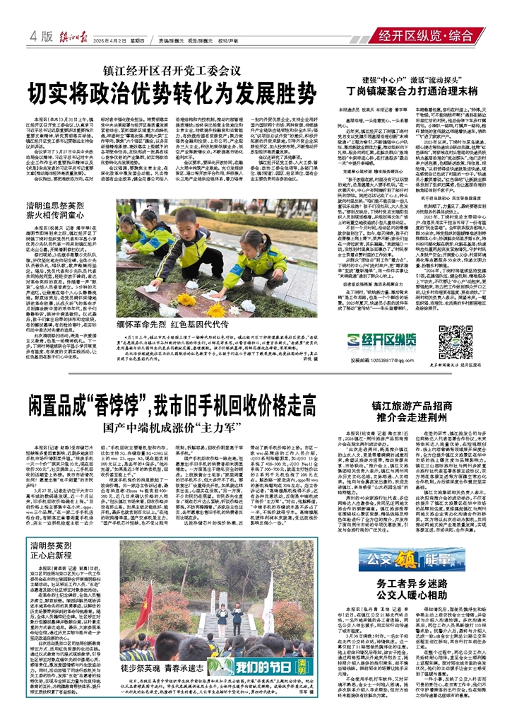 - 清明追思祭英烈 薪火相传润童心 本报讯(祝昊天 记者 潘宇琴)在清明节即将到来之际,镇江经开区丁岗镇丁岗村组织党员代表和平昌小学优秀少先队员代表一同来到镇江经开区北山公墓,开展清明祭扫仪式。 祭扫现场
